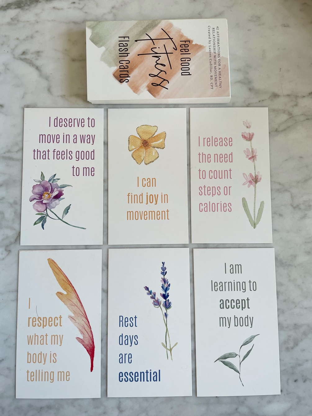42 affirmation flash cards (2.75" x 4.75") for a healthy relationship with movement. These cards are specifically designed to help you create new neural pathways and more supportive thought patterns. By doing so, you heal your relationship with fitness and rediscover the joy of movement. Perfect for those looking to: