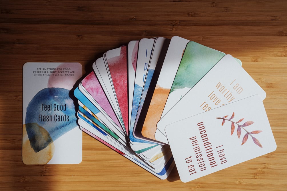 54 affirmation flash cards (2.75" x 4.75") for food freedom and body acceptance. These cards are specifically designed to help you create new neural pathways and more supportive thought patterns. By doing so, you can expedite the process of healing from diet culture. Perfect for those looking to: